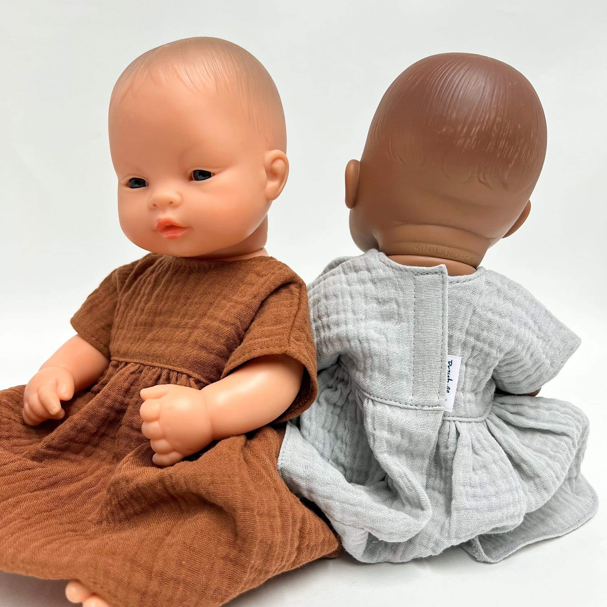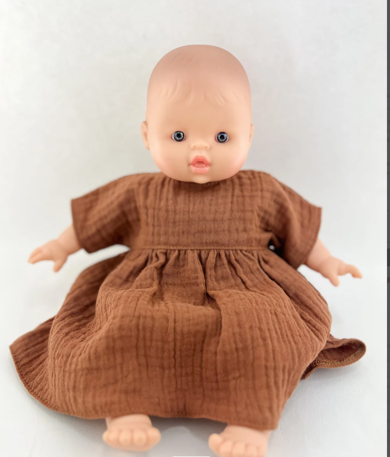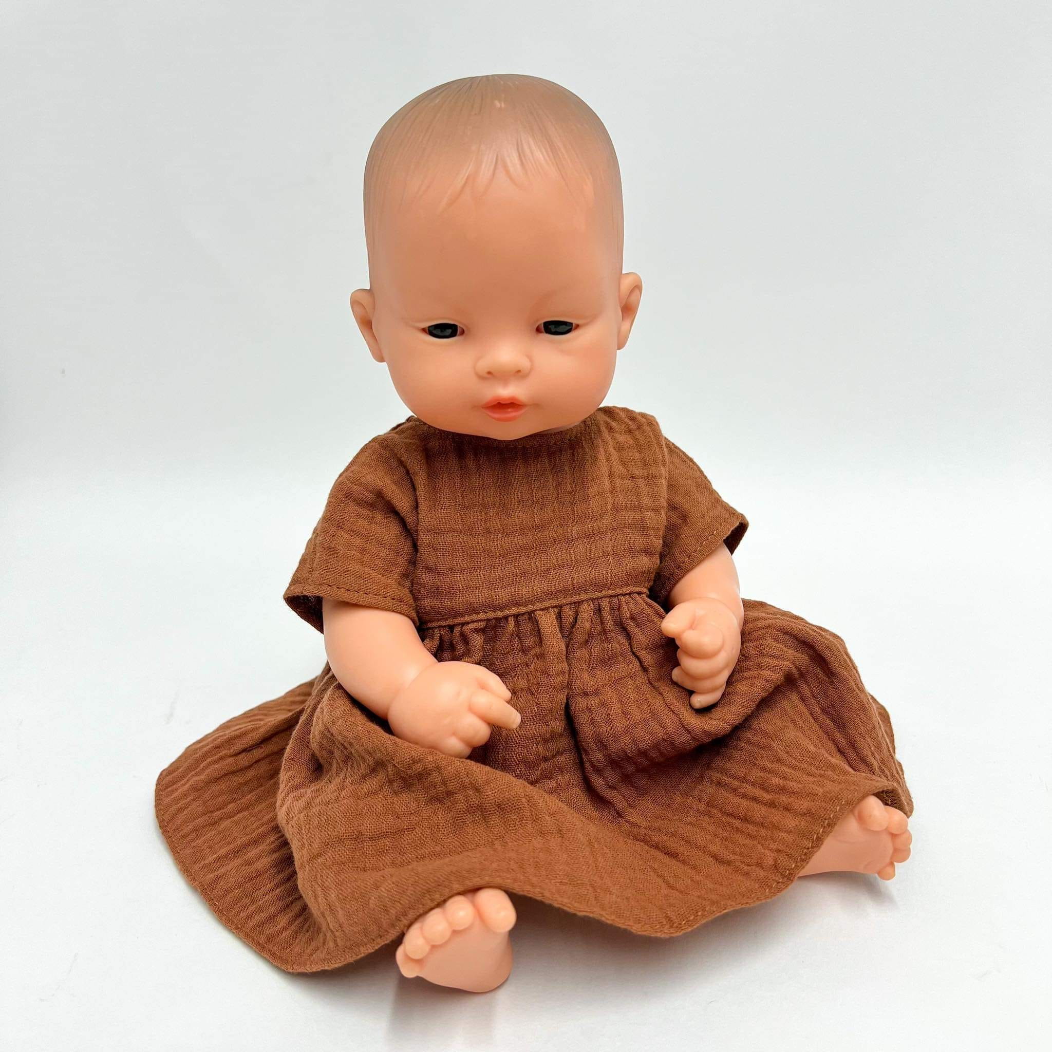 Sukienka muślinowa dla lalki Miniland 32 cm i Minikane 28 cm - cynamon