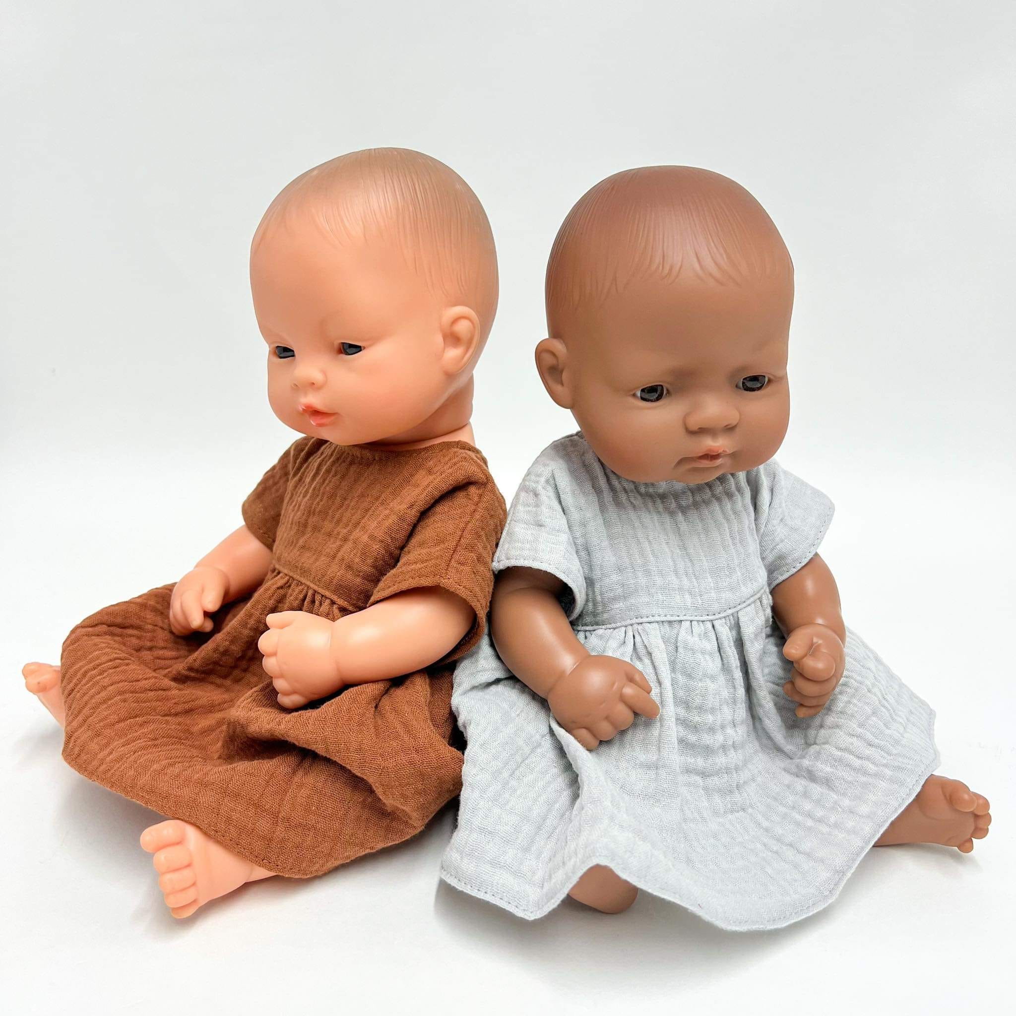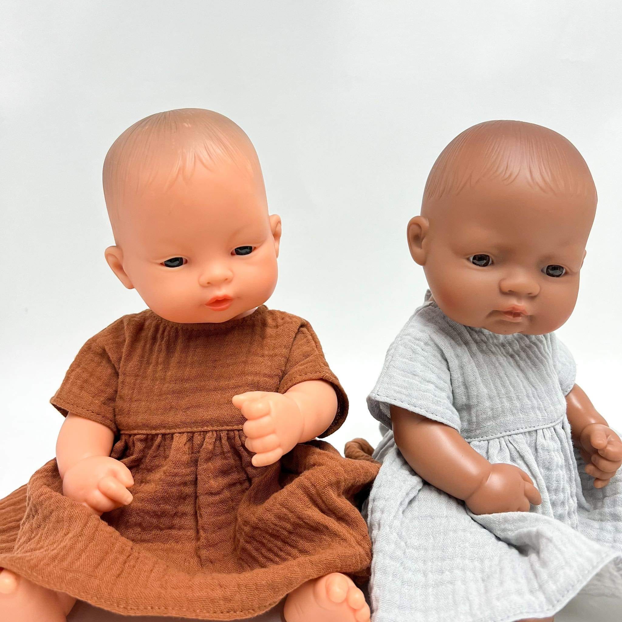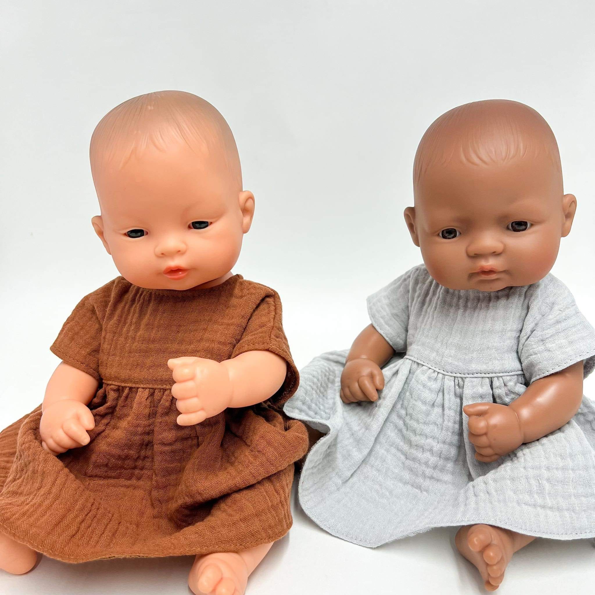 Sukienka muślinowa dla lalki Miniland 32 cm i Minikane 28 cm - cynamon