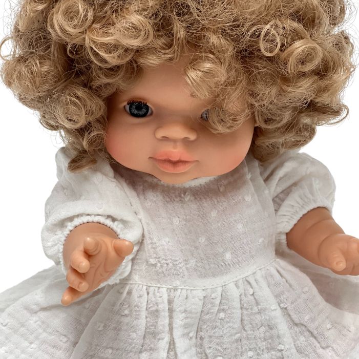 Muślinowa sukienka plumeti uszyta specjalnie dla hiszpańskich lalek Miniland 38 cm. Pasuje również na lalki Minikane 34 cm i lalki Paola Reina 34 cm.